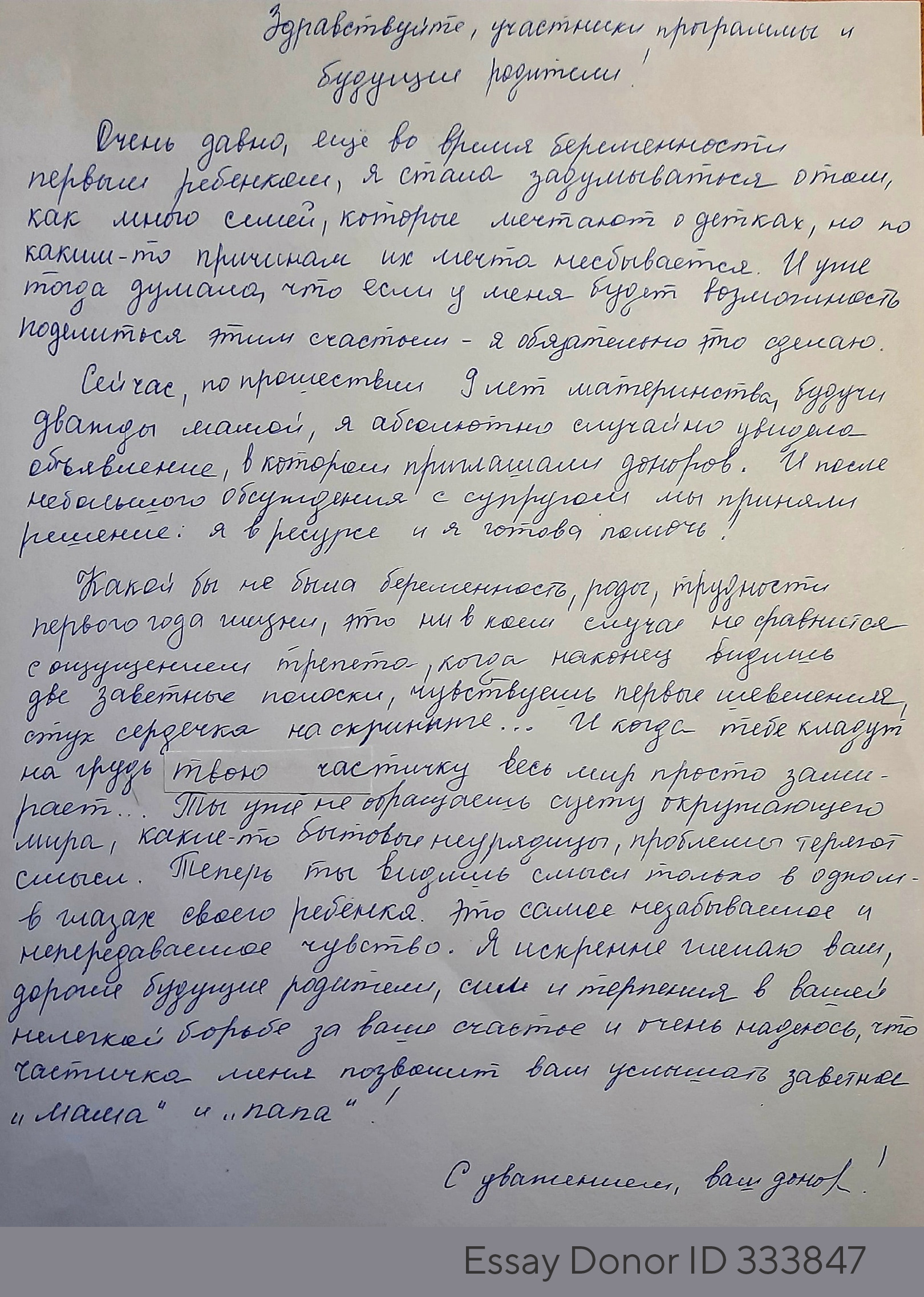 Long ago I started thinking of the couples who want to have kinds but for some reason their dream cannot come true. At that time I thought that had I an opportunity to share this happiness, I would definitely do that. I became an egg donor because I am in a resource and ready to help. |